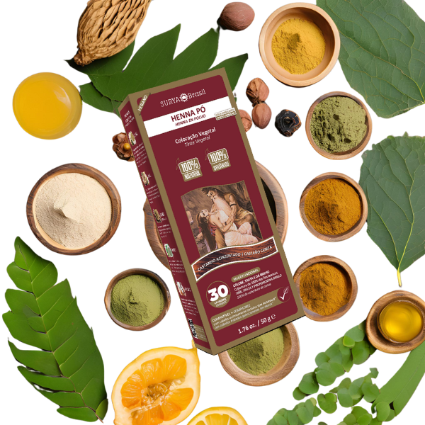 A Henna Pó Surya Brasil é uma coloração semi-permanente com 100% de ingredientes naturais e vegetais, extraídos de plantas e ervas secas originárias da Índia, que colorem, restauram, nutrem e tratam os fios além de cobrirem os fios brancos.