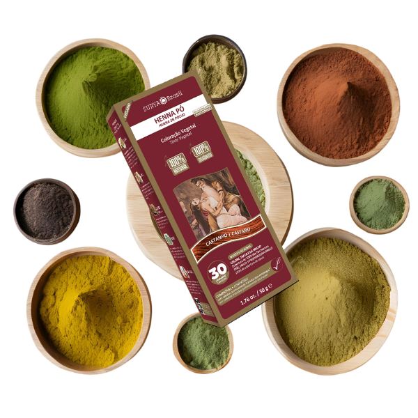 A Henna Pó Surya Brasil é uma coloração semi-permanente com 100% de ingredientes naturais e vegetais, extraídos de plantas e ervas secas originárias da Índia, que colorem, restauram, nutrem e tratam os fios além de cobrirem os fios brancos.