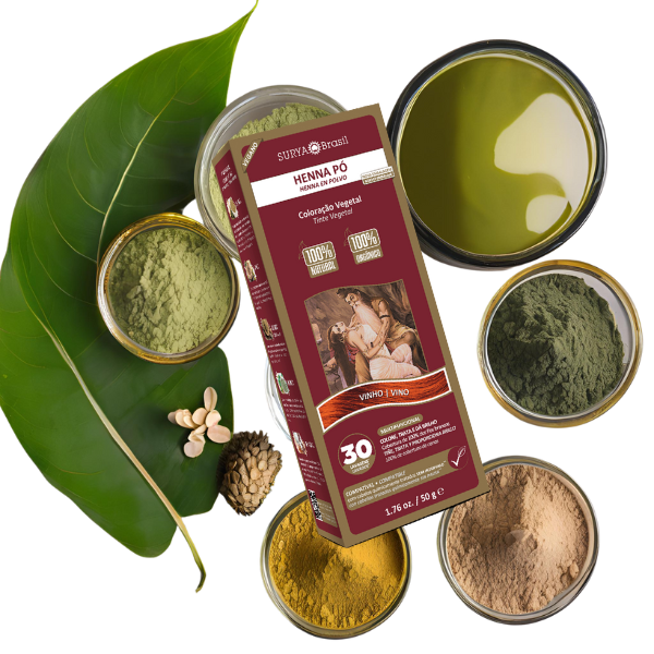A Henna Pó Surya Brasil é uma coloração semi-permanente com 100% de ingredientes naturais e vegetais, extraídos de plantas e ervas secas originárias da Índia, que colorem, restauram, nutrem e tratam os fios além de cobrirem os fios brancos.