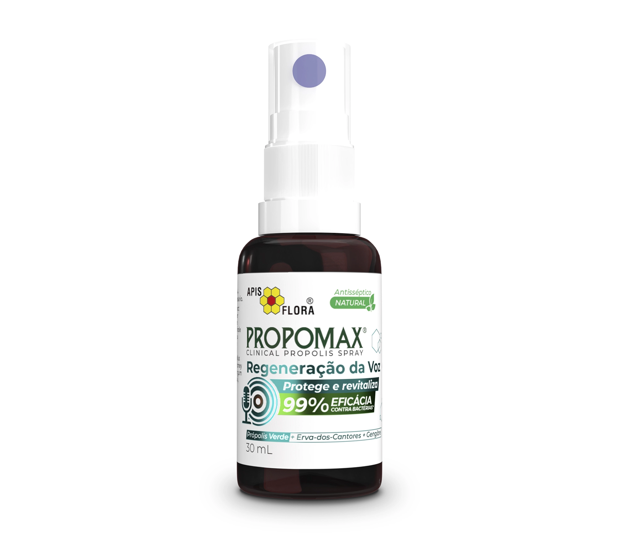 Combinando de maneira eficaz o extrato de própolis verde EPP-AF®, erva-dos-cantores, gengibre e mel, o PROPOMAX® Clinical Regeneração da Voz possui 99% de eficácia contra bactérias causadoras de problemas bucais, como Staphylococcus aureus e Streptococcus mutans.